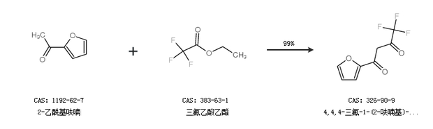 1.通過2-乙?;秽腿宜嵋阴ズ铣?,4,4-三氟-1-(2-呋喃基)-1,3-丁二酮,收率約99%;