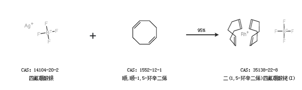 1.通過四氟硼酸銀和順,順-1,5-環(huán)辛二烯合成二(1,5-環(huán)辛二烯)四氟硼酸銠(I),收率約95%;