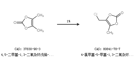 2.通過4,5-二甲基-1,3-二氧雜環(huán)戊烯-2-酮合成4-氯甲基-5-甲基-1,3-二氧雜環(huán)戊烯-2-酮,收率約1%;