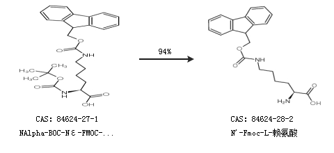 1.通過(guò)NAlpha-BOC-Nε-FMOC-L-賴氨酸合成N''-Fmoc-L-賴氨酸,收率約94%;