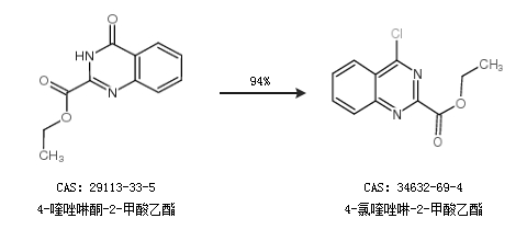 1.通過(guò)4-喹唑啉酮-2-甲酸乙酯合成4-氯喹唑啉-2-甲酸乙酯,收率約94%;
