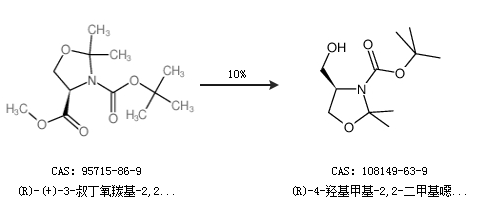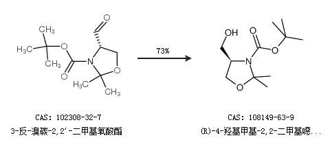 1.通過(guò)(R)-(+)-3-叔丁氧羰基-2,2-二甲基-4-噁唑烷羧酸甲合成(R)-4-羥基甲基-2,2-二甲基噁唑啉-3-羧酸叔丁酯,收率約10%;