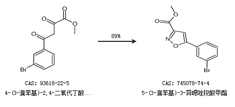 1.通過4-(3-溴苯基)-2,4-二氧代丁酸甲酯合成5-(3-溴苯基)-3-異噁唑羧酸甲酯,收率約89%;