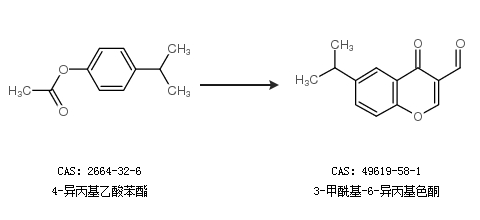 1.通過1-[2-羥基-5-(1-甲基乙基)苯基]乙酮和N,N-二甲基甲酰胺合成3-甲?;?6-異丙基色酮,收率約49%;