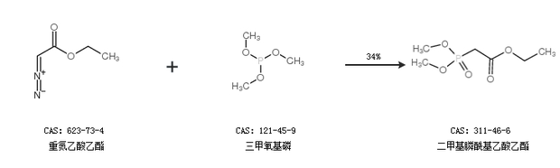 1.通過(guò)重氮乙酸乙酯和三甲氧基磷合成二甲基膦?;宜嵋阴?,收率約34%;