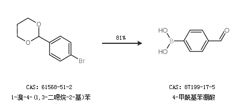 2.通過2-(4-溴苯基)-1,3-二氧戊環(huán)合成4-甲酰基苯硼酸,收率約53%;