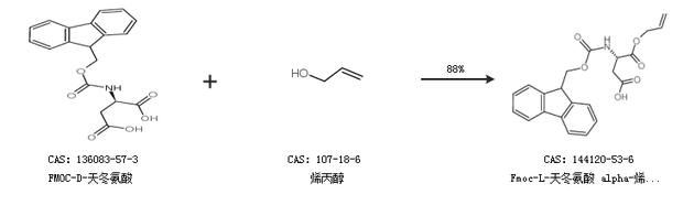 1.通過(guò)FMOC-D-天冬氨酸和烯丙醇合成Fmoc-L-天冬氨酸 alpha-烯丙酯,收率約88%;
