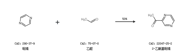 2.通過(guò)吡嗪和乙醛合成2-乙;拎,收率約50%;