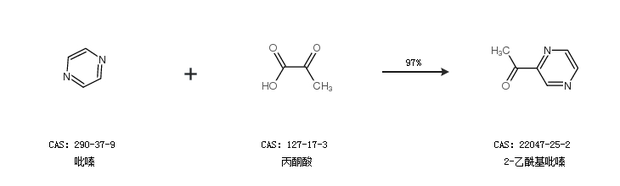 1.通過(guò)吡嗪和丙酮酸合成2-乙酰基吡嗪,收率約97%;