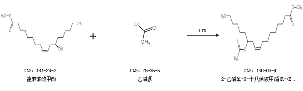 1.通過蓖麻油酸甲酯和乙酰氯合成2-乙酰氧-9-十八烯酸甲酯[R-(Z)-,收率約10%;
