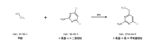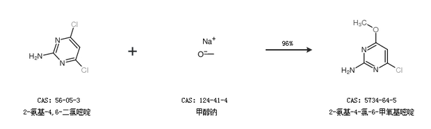1.通過2-氨基-4,6-二氯嘧啶和甲醇鈉合成2-氨基-4-氯-6-甲氧基嘧啶,收率約96%;