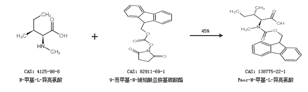 1.通過氯甲酸-9-芴基甲酯合成Fmoc-N-甲基-L-異亮氨酸,收率約70%;