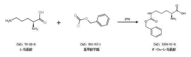 1.通過(guò)L-鳥(niǎo)氨酸鹽酸鹽和氯甲酸芐酯合成N''-Cbz-L-鳥(niǎo)氨酸,收率約80%;