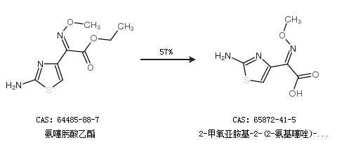 1.通過氨噻肟酸乙酯合成2-甲氧亞胺基-2-(2-氨基噻唑)-4-乙酸,收率約57%;