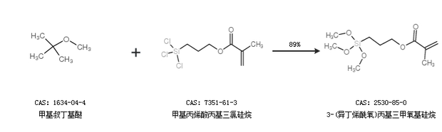 1.通過甲基叔丁基醚和甲基丙烯酸丙基三氯硅烷合成3-(異丁烯酰氧)丙基三甲氧基硅烷,收率約89%;