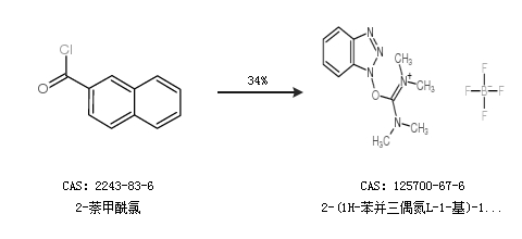 1.通過2-萘甲酰氯合成2-(1H-苯并三偶氮L-1-基)-1,1,3,3-四甲基脲四氟硼酸酯,收率約34%;