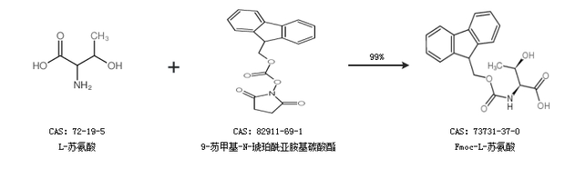 1.通過L-蘇氨酸和9-芴甲基-N-琥珀酰亞胺基碳酸酯合成Fmoc-L-蘇氨酸,收率約99%;
