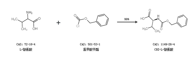 1.通過(guò)L-纈氨酸和氯甲酸芐酯合成CBZ-L-纈氨酸,收率約99%;