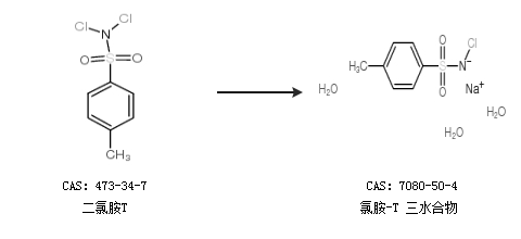 中文別名 氯胺T鈉;氯胺T三水合物;氯胺T,三水合物;三水合氯銨-T;對(duì)甲苯磺酰氯胺鈉三水合物;對(duì)甲苯;