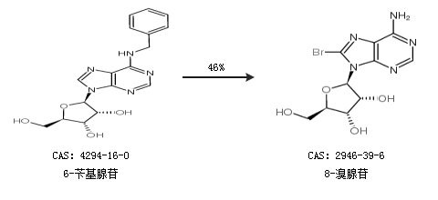 2.通過6-芐基腺苷合成8-溴腺苷,收率約46%;