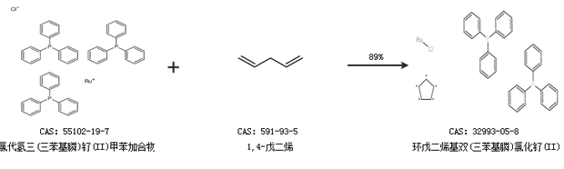 1.通過氯代氫三(三苯基膦)釕(II)甲苯加合物和1,4-戊二烯合成環(huán)戊二烯基雙(三苯基膦)氯化釕(II),收率約89%;