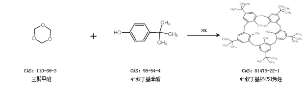 1.通過(guò)三聚甲醛和4-叔丁基苯酚合成4-叔丁基杯[5]芳烴,收率約8%;