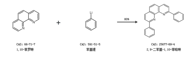 1.通過(guò)1,10-菲羅啉和苯基鋰合成2,9-二苯基-1,10-菲咯啉,收率約80%;