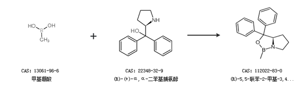 2.通過(guò)甲基硼酸和(R)-(+)-α,α-二苯基脯氨醇合成(R)-5,5-聯(lián)苯-2-甲基-3,4-丙醇-1,3,2-惡唑硼烷