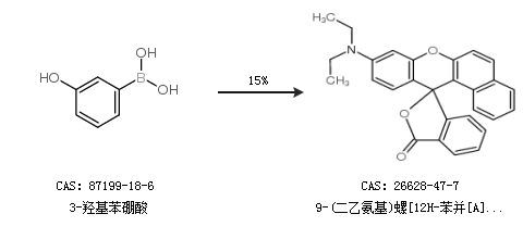 1.通過3-羥基苯硼酸合成9-(二乙氨基)螺[12H-苯并[A]占噸-12,1,(3,H)-異苯并呋喃]-3,-酮,收率約15%;