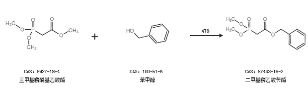 2.通過三甲氧基磷和溴乙酸芐酯合成二甲基膦乙酸芐酯,收率約82%;