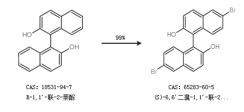1.通過R-1,1''-聯(lián)-2-萘酚合成(S)-6,6''二溴-1,1''-聯(lián)-2-萘酚,收率約99%;
