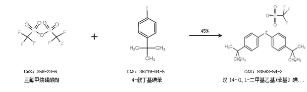 2.通過(guò)三氟甲烷磺酸酐和4-叔丁基碘苯合成雙[4-(1,1-二甲基乙基)苯基]碘鎓與三氟甲磺酸的鹽,收率約45%;