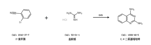 2.通過2-溴苯腈和鹽酸胍合成2,4-二氨基喹唑啉,收率約64%;