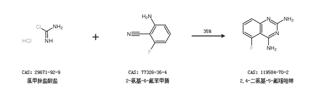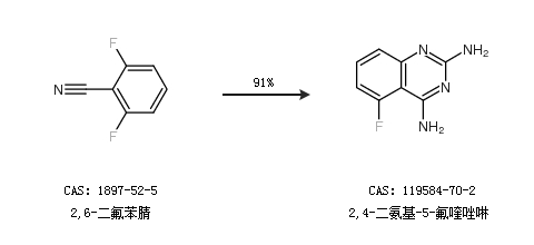 1.通過(guò)2,6-二氟苯腈合成2,4-二氨基-5-氟喹唑啉,收率約91%;